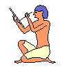 (Le musée du Louvre possède une statue de scribe exceptionnelle. Malgré la dénomination de "scribe accroupi", l'homme est assis en tailleur dans la position traditionnelle du lotus, la jambe droite croisée devant la gauche, son rouleau de papyrus ouvert, tenu dans la main gauche. La main droite tenait le calame, aujourd'hui disparu.)