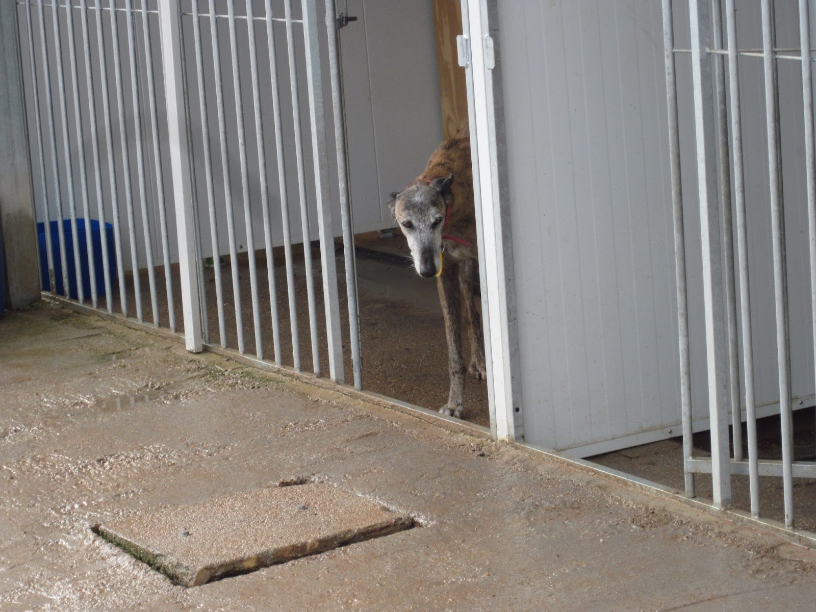 Nous entrons ensuite dans le bâtiment principal du refuge. Les portes s'ouvrent, et derrière c'est la cour des miracles ! Des dizaines et des dizaines de chiens de tous les côtés, surtout des podencos et croisés podencos, de taille moyenne et petite. Partout, partout, partout. Christine, Yohann et moi commençons notre travail : photographier, répertorier, mesurer un par un tous les lévriers et croisés lévriers que nous trouvons, afin de les diffuser et leur offrir une chance de trouver une famille en France ou en Belgique. Car ici, en Espagne, ils n'ont aucune chance. Karen nous explique que les lévriers ne sont même pas diffusés sur leur site internet car un galguero ou un gitan pourrait reconnaître ou repérer un galgo ou un podenco et venir le voler.Ca et là, les bagarres éclatent entre les chiens. Ils sont tellement nombreux... Certains, comme Eros, croisé galgo bringé, (photo ci-contre) portent d'innombrables cicatrices qui en disent long sur ce qu'il arrive aux plus faibles d'entre eux.