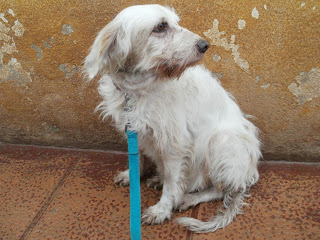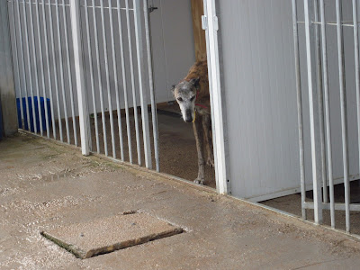 Puis, nous entrons dans la partie réservée aux galgos édifiée par une association de sauvetage de lévriers hollandaise. C'est un bâtiment récent construit sur l'ancienne fosse où étaient enterrés les chiens au temps de la perrera. Les galgos mâle sont séparés des femelles, ils disposent de box en béton avec des niches,l'association a fait un travail remarquable !Je repère directement Hawai, la galga au sourire éternel qui fera aussi partie du voyage ! Elle est magnifique, je suis émue de la voir en vrai. Les galgos nous sautent dessus, se blôtissent contre nous, nous demandent des caresses, de l'attention. Et nous continuons notre travail d' « inventaire » : leur nom, leur âge, leurs signes particulier, leur caractère... Christine tombe amoureuse d'Orion, un magnifique galgo noir et âgé que personne ne regarde. Mais elle sait qu'elle ne pourra pas rentrer avec, et c'est dur. Parmi les nouvelles entrées aujourd'hui, il y a Montréal, galgo barbudo (photo ci-contre), qui fait ses premiers pas au refuge avec nous, il semble bien s'intégrer.