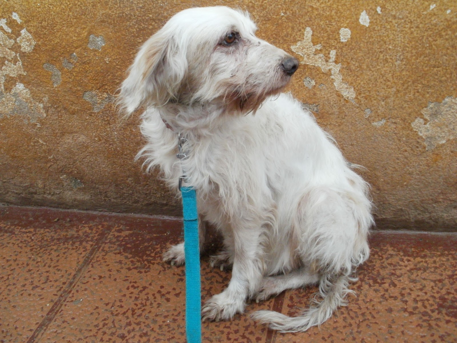 Du côté des femelles, Maine nous hypnotise par sa beauté et prend la pose longuement devant l'objectif de Christine. Parmi elles, des Mastines, (photo ci-dessous)et l'une d'elle notamment qui est là depuis toujours, depuis l'époque de la perrera. Qu'a-t-elle vu elle aussi ? Qu'a-t-elle vécu ? Senda a 9 ans et finira sûrement ses jours ici. Elle n'aura jamais eu la chance d'être aimée par une famille rien qu'à elle... Karen me demande de veiller quelques instants sur une petite chienne qui vient d'arriver au refuge et de lui donner un nom. Je la prénomme Panda (photo ci-dessous) car elle est blanche avec des croûtes noires autour des yeux. Nous attendons dans le sas d'entrée. Je tente de la rassurer, elle est si petite. Panda regarde de l'autre côté de la porte les autres chiens aboyer contre le grillage. Dans ses yeux je lis la détresse qu'elle doit ressentir, comme si elle me demandait : « C'est là qu'on va me mettre ? Je n'ai pas envie d'y aller! ». Je me sens si triste... car je sais que Panda entre ici aujourd'hui mais en sortira-t-elle un jour ?