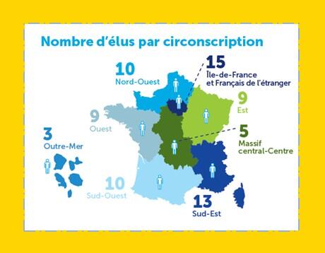 - Outre-Mer: 3 sièges pour la circonscription qui regroupe Saint-Pierre-et-Miquelon, la Guadeloupe, Saint-Barthélemy, Saint-Martin, la Martinique, la Guyane, la Réunion, Mayotte, la Nouvelle-Calédonie, la Polynésie française et Wallis et Futuna.