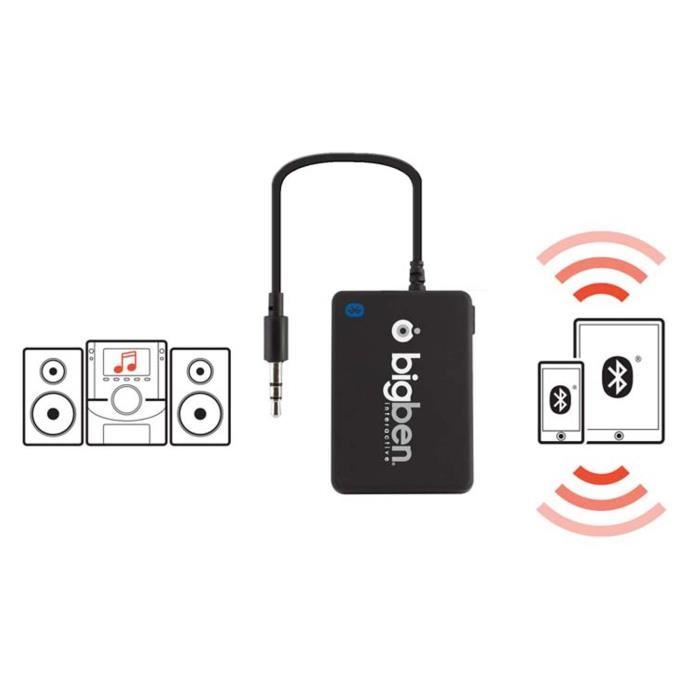 Adaptateur Audio Bluetooth Bigben - Permet de rendre compatible Bluetooth n'importe quel systeme audio - Installation ultra simple - Systeme Plug & Play - Fonctionne avec tous les docks, enceintes et systemes audios équipées d'une entrée Jack 3.5 mm - Technologie Bluetooth 2.0 - Batterie 250 mAh - Câble de charge USB inclus - Garantie Constructeur : 1 an