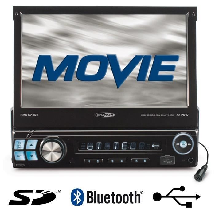 Caliber RMD574BT Autoradio écran motorisé tactile 7" - Puissance maximale 4 x 75W - Lecture clé USB et carte SD - Auxiliaire IN : Entrée audio vidéo 3.5mm jack stéréo (câble inclus) - Bluetooth kit mains libres avec micro - Garantie 1 an