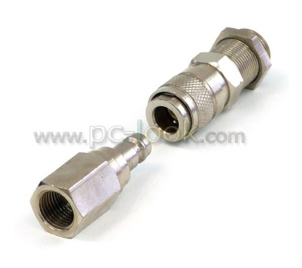 Facilitez-vous la vie ! Watercooling Q uick Coupling Kit - Bulkhead - G1/4'''' - Phobya - Silver Grâce à ce kit de couplage vous pourrez librement connecter et déconnecter des éléments de votre circuit de watercooling sans avoir à le vider ou à risquer d'importantes fuites ! Cette version spéciale ''''Passe Cloison'''' permet de fixer le connecteur femelle sur une paroi après l'avoir percée.En effet, grâce à un filetage plus long et à un écrou de serrage, en utilisant deux unités de ce produit, vous pourrez réaliser une connexion externe fixée à votre boitier. Il suffira alors de venir ''''brancher'''' la partie externe de votre circuit, et ce d'une seule main !!! Caractéristiques : Système fiable et professionnel (en métal) Se connecte à chaque extrémité sur des embouts filetages 1/4'''' Les deux pièces se séparent par simple décalage manuel de la bague de rétention Quelques gouttes de liquide peuvent s'échapper au moment de la déconnexion Specifications : Matériaux : Laiton plaqué NickelFiltage : G1/4''''