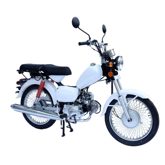 Mobylette 49cc 4 temps - Démarrage électrique + kick - Vitesse 65 km/h - Frein AV / AR : Tambour - Pneu AV/AR : 2.25-17 / 2.50-17 - Hauteur de selle : 780mm - Poids net : 70 kg