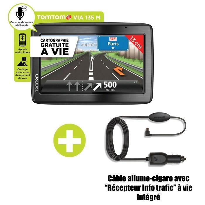 GPS TomTom Via 135 M Cartographie a vie - Ecran tactile 5" (13 cm) - Cartographie Europe 45 pays - Fixation intégrée avec écran a bascule - Commande vocale intelligente - Appels mains-libres - Chargeur USB de voiture - Câble USB - Parking a proximité - Destinations fréquentes - Service TomTom Zones de danger - IQ Routes - Garantie 2 ans