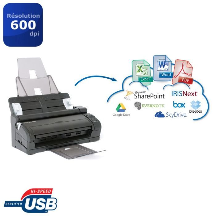 Scanner multifonction - Capteur d'images par contacts - Résolution optique 600ppp - Interface USB2.0 - Base amovible pour numériser des documents en déplacement - Conversion des documents papier, des fichiers pdf ou images - Logiciel d'OCR Readiris Corporate 14 inclus - Chargeur automatique d'une capacité de 50 pages