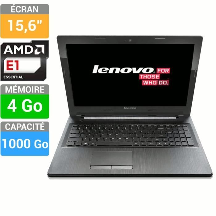 Ordinateur portable avec écran 15,6" HD - Processeur AMD E1 6010 - Mémoire 4Go - Stockage 1To (1000Go) - Carte graphique AMD Radeon R2 - Wifi - Bluetooth - USB 3.0 - HDMI - VGA - Webcam 720p - Lecteur de carte 2-en-1 (SD/MMC) - Ethernet 100/1000 - Graveur DVD - Clavier AZERTY - Windows 8.1 - Garantie 1 an