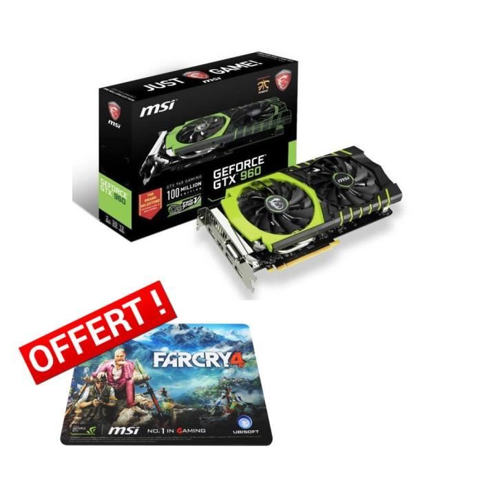 Carte graphique NVIDIA GeForce GTX 960 Gaming - Edition 100 Million - GPU cadencé 1216MHz - GPU boosté a 1279MHz - Mémoire 2Go DDR5, interface 128 bits - PCI Express3.0 - DVI/HDMI/Display Port - DirectX12 - OpenGL 4.4 - Format ATX - Réf. GTX 960 GAMING 100ME + Tapis de souris FARCRY 4 OFFERT