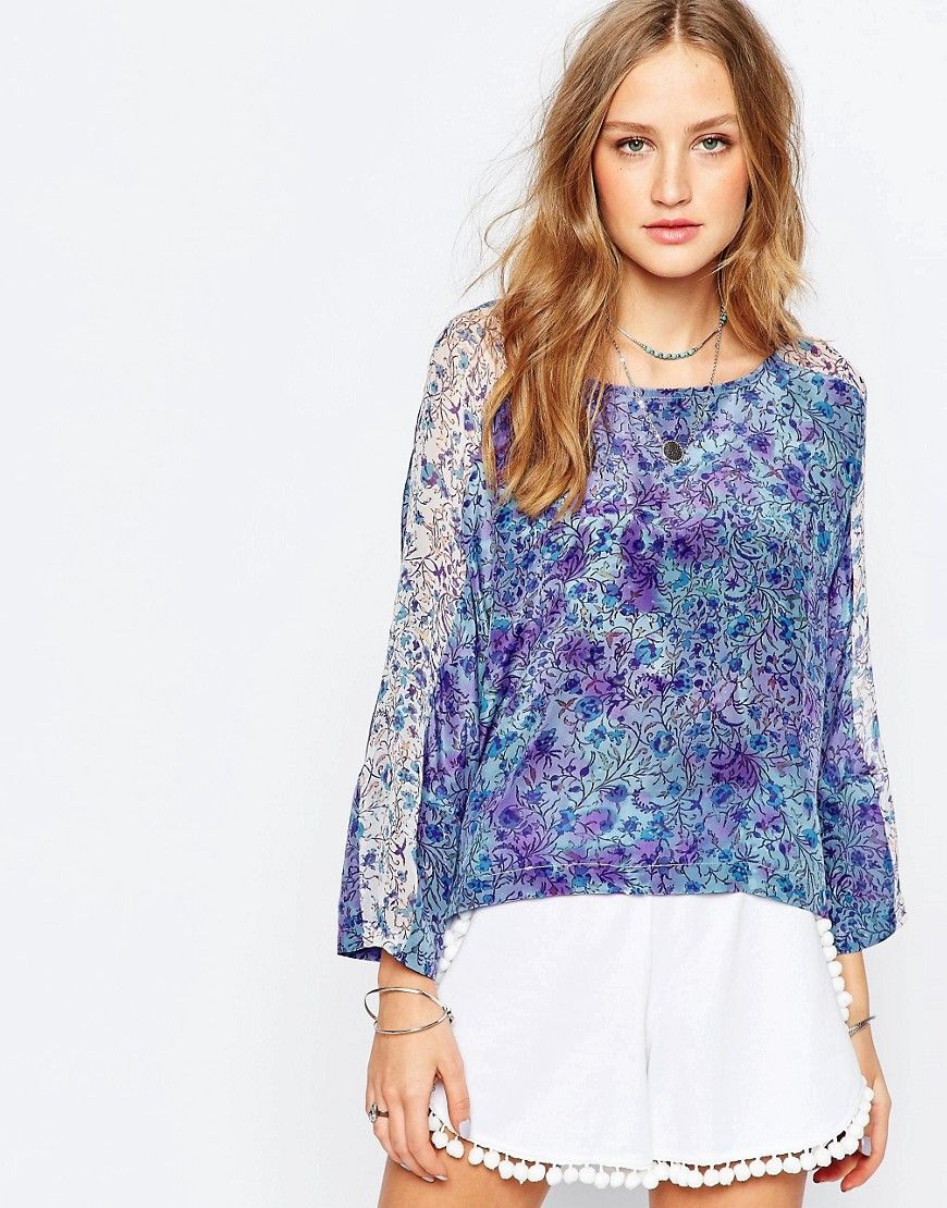 Top par Gypsy 05, Mousseline de soie imprimée, Encolure dégagée, Manches kimono, Coupe classique taillant normalement, Nettoyage à sec par un professionnel, 100% soie, Le mannequin porte l'article en taille UK S / EU S / US XS.