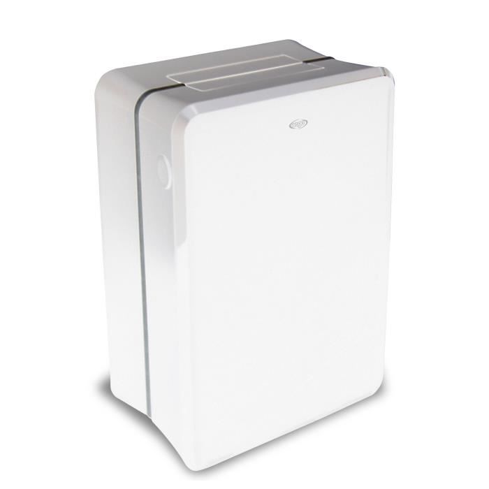 Climatiseur mobile monobloc - Puissance frigorifique 2400 W - Puissance de déshumidification 1.25 l/h - Puissance absorbée 870 W - 4 roulettes - Débit d'air jusqu'a 400 m3/h - 3 vitesses + auto - Puissance acoustique 60 dB - 2 filtres lavables - Télécommande - Mode nuit - Programmation 24h/7 jours - Classe énergétique A - Coloris blanc