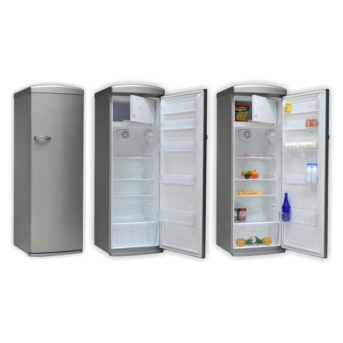 Réfrigérateur 1 Porte - Volume total 311L (281+30) - Classe énergétique A+ - Froid brassé - Capacité de congélation 2 kg / 24h - Dégivrage automatique du réfrigérateur - Design Vintage - Coloris Silver - Garantie 2 ans pieces - Pose libre -