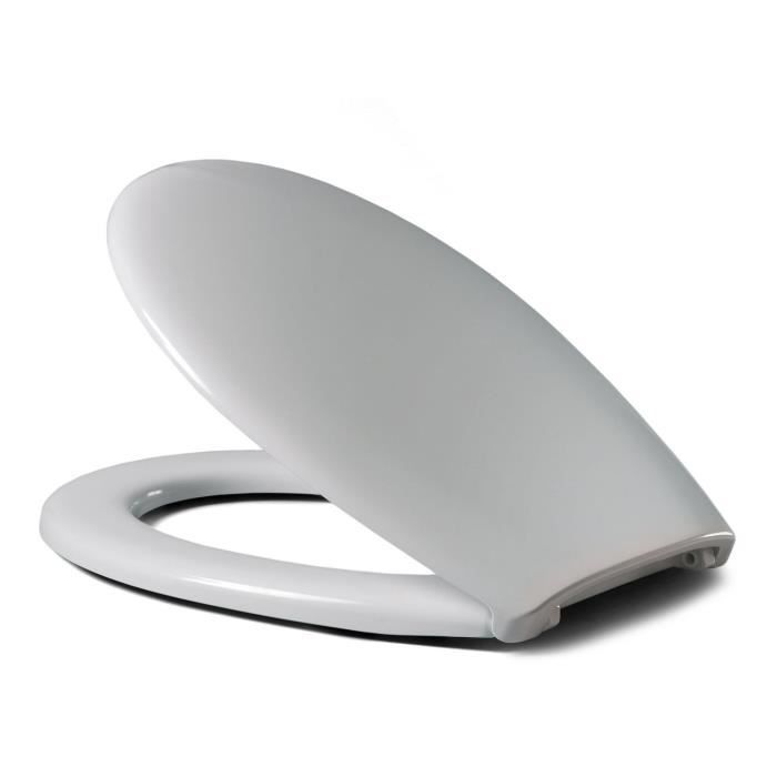 Abattant durable et hygienique grâce a une surface lisse et sans pores dont l'optique se rapproche au plus pres des cuvettes céramiques - Confort d'utilisation pour toute la famille grâce a sa fonction frein de chute : plus de doigts d'enfant coincés et de chute bruyante ! - Montage rapide et forme universelle
