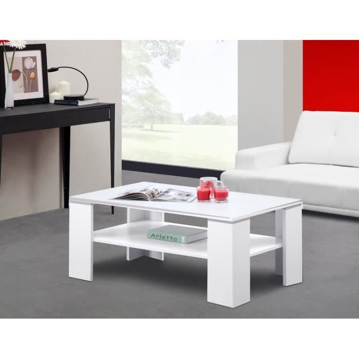 Table basse CLEMENCE Structure en panneau de particules recouvert papier décor blanc. Dimensions : 100 cm x 59 cm x H43cm.