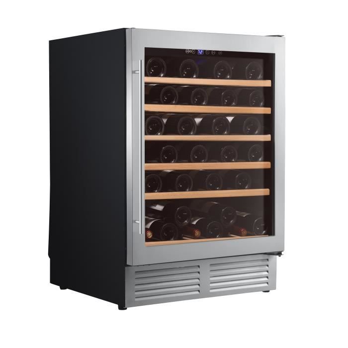 Cave a vin de service encastrable - Capacité 51 bouteilles - Porte vitrée réversible - 6 clayettes fixes en bois - Température 5 a 22° - Régulation électronique - Eclairage LED - Systeme anti-vibration - Cadre inox