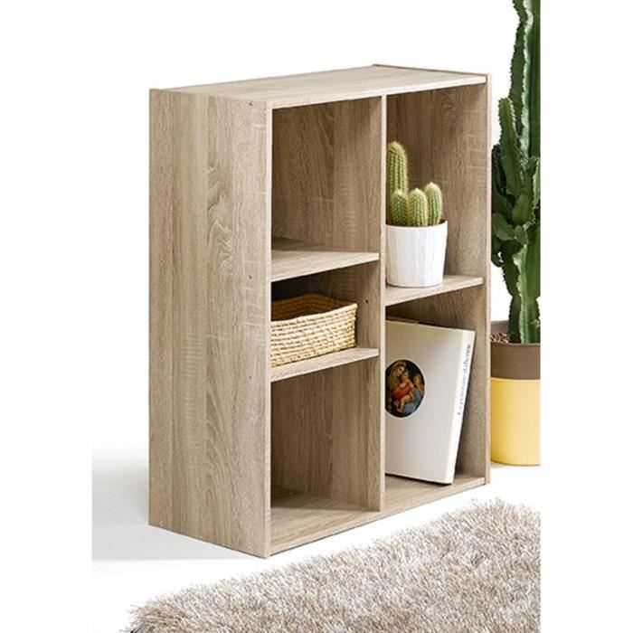 Meuble de rangement 5 cases asymétriques - Dimensions des cases : 28x28x28 cm - Matiere : panneaux de particules épaisseur 12mm - Coloris : chene.