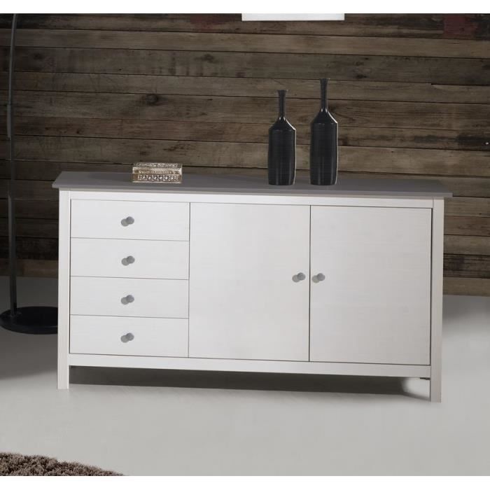 Buffet bas 2 portes + 4 tiroirs en pin massif - Structure teintée blanche + plateau teinté gris