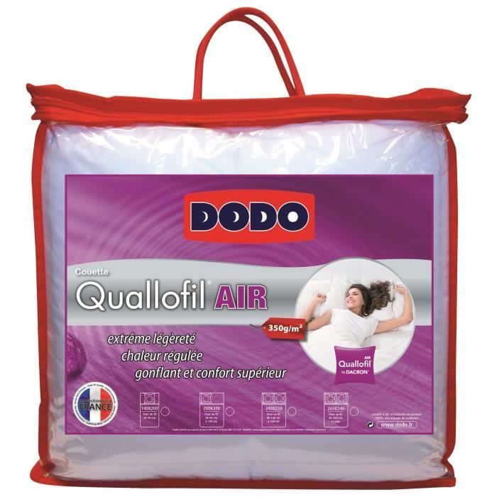 DODO Couette Quallofil Air 220x240cm - Enveloppe : 100% Coton Percale - Garnissage : 100% polyester Quallofil Air 350g/m2 Fibre Creuse Siliconée - Biais Double piqûre de renfort - Lavage a 40°C - Fabrication Française.