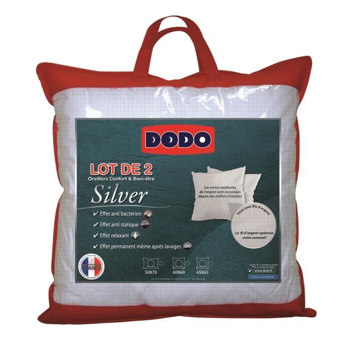 DODO Lot de 2 oreillers silver 65x65cm - Enveloppe : 60,4% coton 39,3% polyester 0,30% fil de carbone - Garnissage : 100% Polyester fibre creuse siliconée - Confort souple, enveloppe avec fil d'argent double effets anti-bactérien et relaxant. Garnissage ultra doux, entretien facile - Fabrication Française.