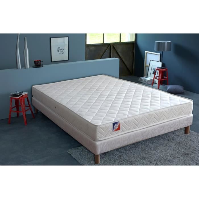 Matelas mousse polyuréthane 25kg/m3 140 x 200 cm - Epaisseur : 17 cm - Confort : ferme - Anti-bactérien, anti-acarien - Coutil : 60% polypropylene 40% polyester - Garnissage 2 faces 300g/m2 de ouate polyester - 1 sommier monobloc 14 cm d'épaisseur et 9 lattes - 4 pieds - Garantie 7 ans : 5 ans + 2 ans d'extension FINLANDEK