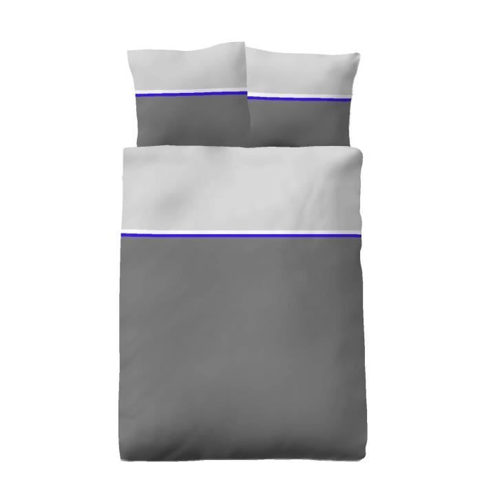 FINLANDEK Parure HELY BLUE comprenant 1 housse de couette 140x200cm et 1 taie d'oreiller 65x65cm a volant plat - Coloris : gris clair et gris foncé, liseré bleu - Fermeture boutons - Composition : 100% coton - Tissage serré : 57 fils - lavage a 40°