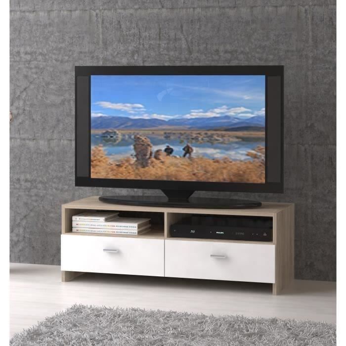 Meuble TV 95 cm en bois aggloméré - 2 abattants - Poignée en matiere plastique effet aluminium - Pieds en matiere plastique, un pied réglable - Coloris : chene / blanc - Dimensions : 94,7 x 34,6 x 35,8 cm - Poids : 15 kg