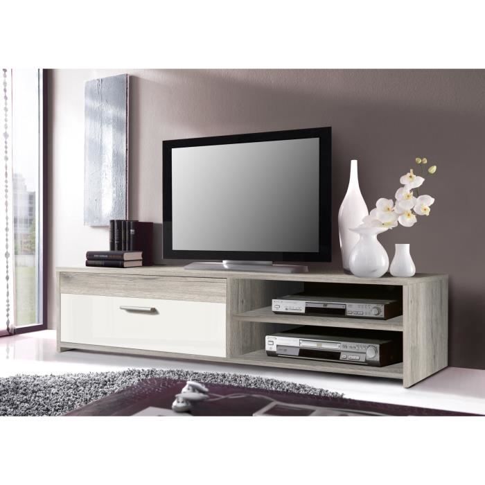 Meuble TV avec 1 abattant et 2 niches - Dimensions abattant : 45,3 x 12,2 x 38,8 cm - Dimensions niche : 45,3 x 12,2 x 40,5 cm - Matiere : bois aggloméré - Coloris : chene cendré/ blanc brillant - Dimensions meuble : 120 x 42,1 x 31,8 cm - Poids : 19 kg