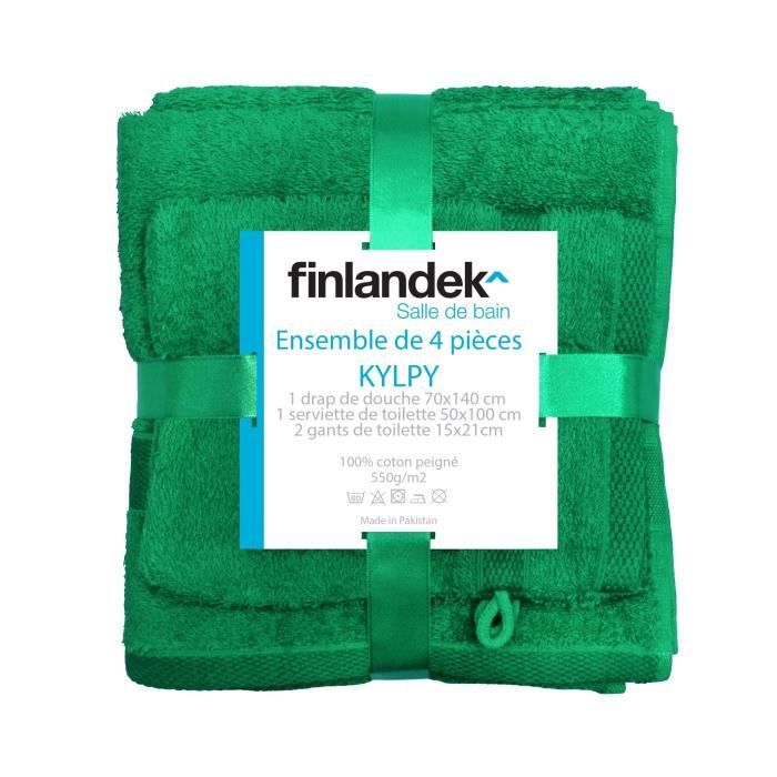 FINLANDEK Set de 4 Pieces KYLPY VERT comprenant 1 drap de douche 70x140cm + 1 serviette de toilette 50x100cm + 2 gants de toilette 15x21cm - Composition : 100% coton peigné 550 g/m2 - Fibre naturelle - Coton moelleux et tres absorbant.
