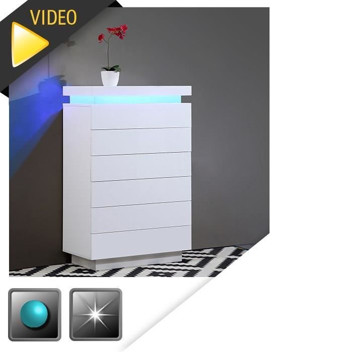 FLASH Chiffonnier 6 tiroirs en MDF laqué blanc brillant - Dimensions : 73 x 40 x 114 cm - Equipé de leds bleus