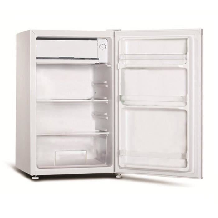 Réfrigérateur top - Volume 85L dont Freezer 8L - Classe énergétique A+ - Largeur 47.5 cm - Dégivrage semi-automatique - 1 clayette verre - Porte réversible - Eclairage intérieur - Thermostat mécanique - Coloris blanc