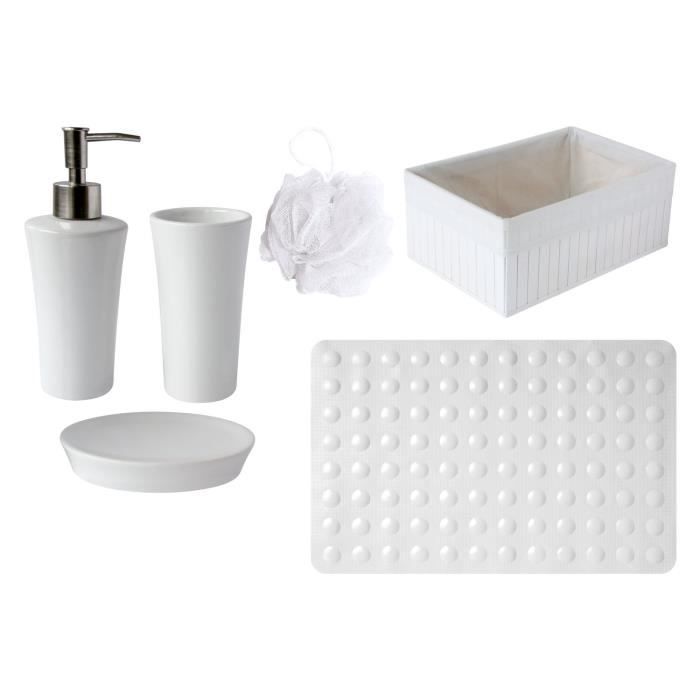 GELCO Trendy 2 Blanc - Lot comprenant : Gobelet, Distributeur savon, porte savon (Matiere : céramique), Fleur de douche , Boite (Matiere : Bambou), Tapis tidérapant (35x53)