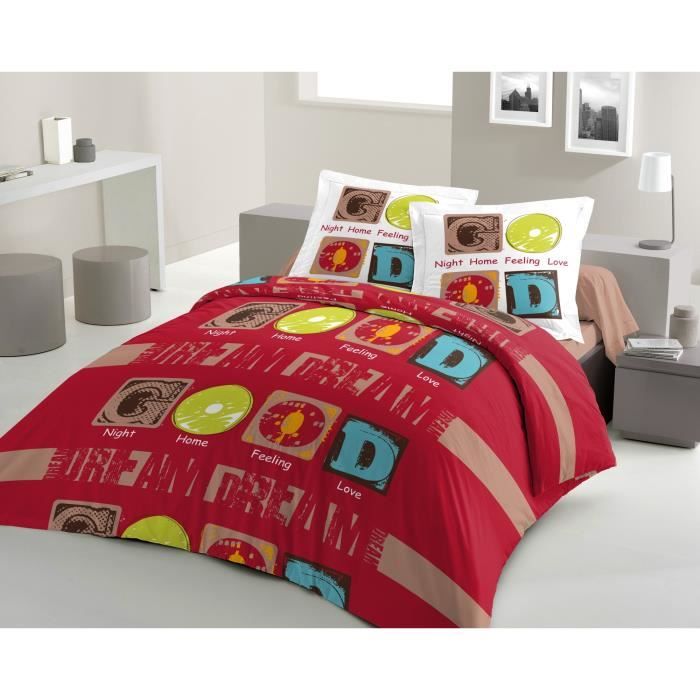 LOVELY HOME Parure GOOD DREAM ROUGE comprenant 1 housse de couette 200x200cm + 2 taies d'oreiller 65x65cm - 2 personnes - Composition : 100% coton 57 fils - Fibre naturelle - Lavable a 40°C