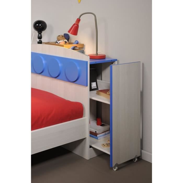 HUGO Environnement de lit L104 cm en panneaux de particules - Papier décor frene nordique/bleu - Tete de lit amovible, montage sur roulette - Plateforme supérieure : L100 x P30 cm - 2 tablettes intérieures L50 x P25 cm - Montage reversible - Livré démonté - Dimensions LxHxP : 104 x 77 x 30 cm