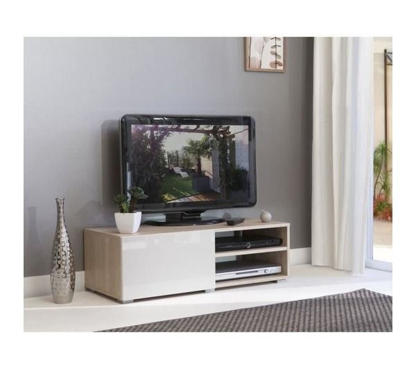 Meuble TV finition chene Bardolino naturel 2 niches, 1 porte laquée blanche. Niches ouvertes a l'arriere pour passer les câbles des appareils multimédia. Dimensions produit monté : L/H/P : 96 x 31 x 42 cm. A base de panneaux de particules, épaisseur 16 mm. Livré avec notice de montage. Conditionnement en 1 colis.