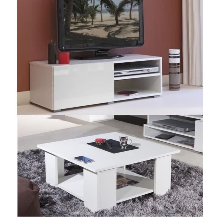 • LIME Salon complet coloris blanc brillant 2 pieces 1 meuble TV 96cm + 1 table basse carrée