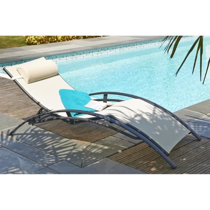 Lot de 2 Chaises longues aluminium et textilene - Ecru et alu noir - Armature : aluminium - Assise et tétiere : textilene - Dimensions : L 170 x l 70 x H 30 cm.