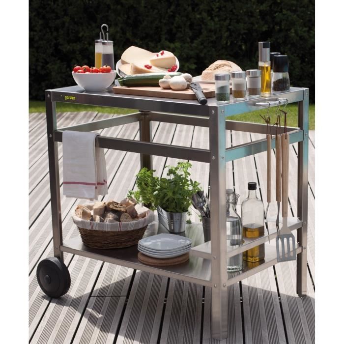 Meuble d'appoint servant aussi bien de plan de travail ou de rangement que de table pour plancha a poser - 100 % aluminium européen - 2 roues pour faciliter le déplacement - Porte bouteille intégré - Dimensions monté : 90 x 65 x 80 cm.