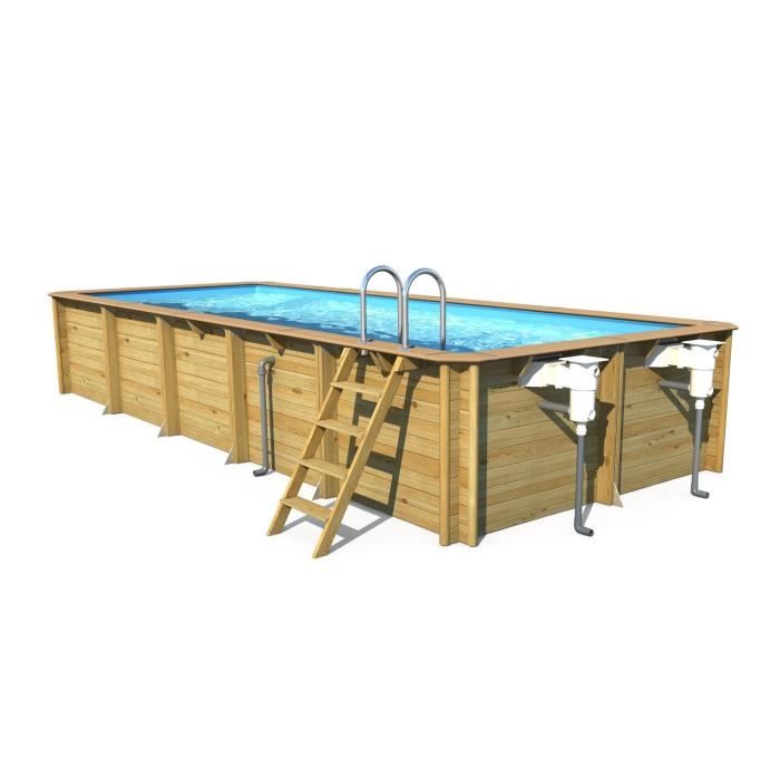 Piscine bois 12x4 m Hauteur 1.46 m - Garantie 10 ans bois et liner - Fabriquée en FRANCE - Hors sol ou enterrée - Volume 63,84m3 - Liner 75/100 bleu - Margelle composite havane - 2 Skimmers 2 Refoulements 2 projecteurs - Filtre a sable - 9,80 m3/h - Echelle sécurité extérieure bois - Echelle inox, Déchlorinateur, Bâche a bulles.