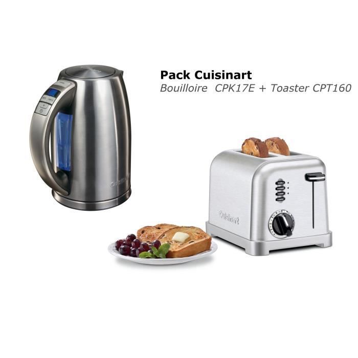 Pack Bouilloire + Toaster - Bouilloire : revetement en acier brossé inoxydable, 2 températures, base pivotante a 360°, volume d'eau apparent, écran LCD, filtre amovible et lavable - Toaster : design en acier brossé inoxydable, 6 niveaux de réglage, arret et éjection automatiques, touche stop, tiroir ramasse-miettes, range cordon