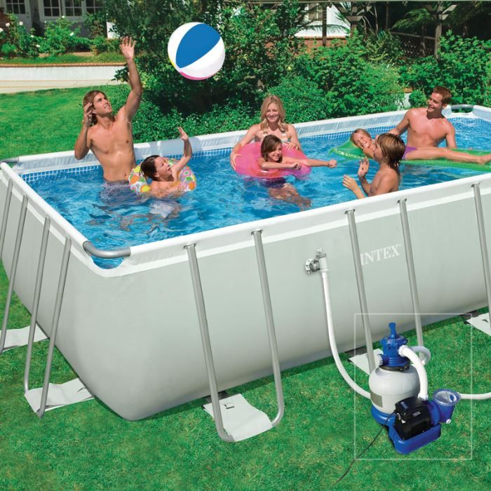 Piscine tubulaire Ultra Silver Intex 5,49 x 2,74 m rectangulaire - Dimensions hors tout : 6,05 x 3,30 m - Dimensions surf. de nage : 5,28 x 2,46 x 1,14 m - Capacité : 17,2 m³ - Débit de la filtration : 6 m³/h - Temps de montage : 60 min - Filtre a sable 6 m³/h / 0,5 CV - Echelle de sécurité avec marches amovibles - Skimmer de surface et d'autres accessoires.
