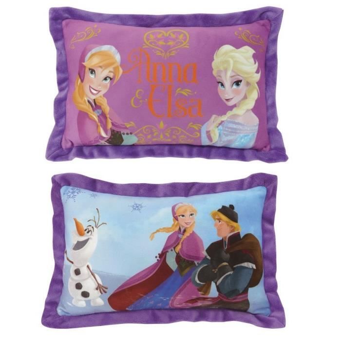 Coussin rectangulaire en velours imprimé et garnissage polyester. Coloris selon disponibilité parmi les modeles ''Anna et Elsa'' (coloris violet) ou ''Anna, Olaf et Kristoff'' (coloris bleu). Fille - Des 12 mois - Livré a l'unité.