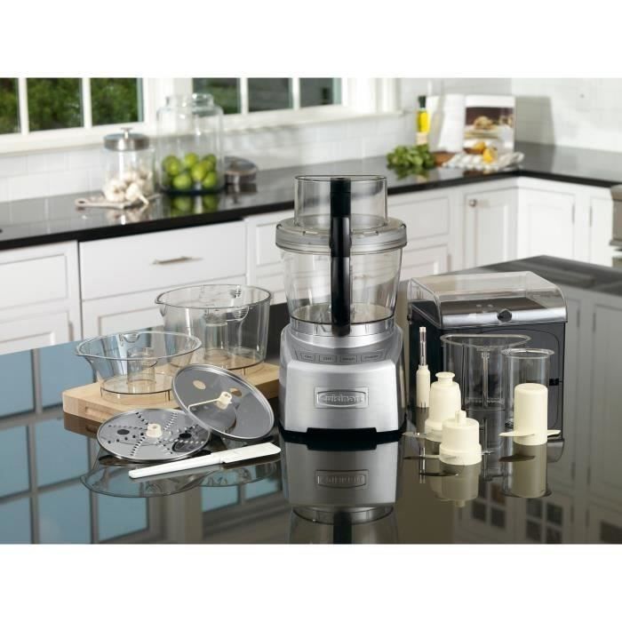 Robot multifonctions - Moteur a induction : 1400 W - Fonction pétrissage - Mode pulse - Socle en aluminium massif - 3 bols multi-usages encastrables - 2 disques de préparation - 3 lames en acier inoxydable - Batteur avec 2 fouets- Systeme bloc-lame - Couvercle avec joint étanche - Boîte de rangement sécurisée - Spatule - OFFERT : livre de recettes « Les recettes essentielles» de Cuisinart & Paul Bocuse