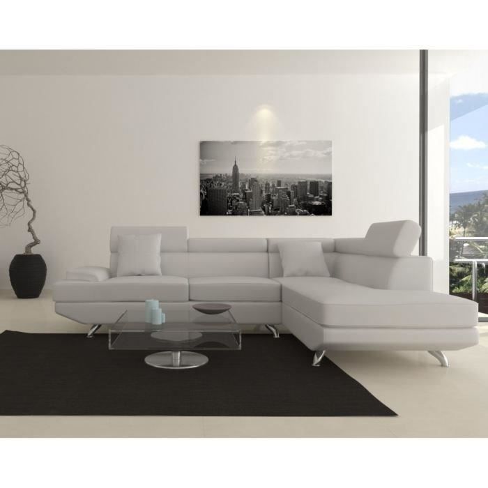 Canapé en PU fixe d'angle droit, tetieres relevables - 4 places - Coloris blanc - Dimensions : 259 x 182 x 80 cm - Design contemporain - Revetement PU - Structure bois et métal - Assise mousse densité 35kg/m3 - Pieds en acier a visser - Garantie 1 an