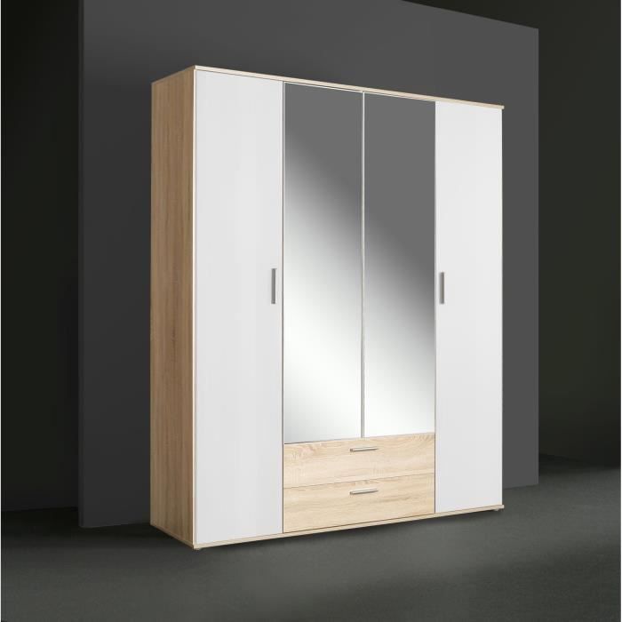 NANO, armoire de chambre contemporaine - 2 portes en bois - 2 porte en verre - 2 tiroirs coloris chene - Coloris : blanc/chene - Dimensions : 160 x 200 x 54 cm - Meuble en bois aggloméré - Garantie : 2 ans pieces, main d'oeuvre et déplacement