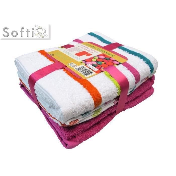 Lot de 4 serviettes SOFTI comprenant 2 serviettes invités 40x60cm + 2 serviettes de toilette 60x100cm (1 unie et 1 rayée multicolore de chaque taille) - modele CANDY BRIGHT ROSE - Composition : 70% Coton 30% Polyester