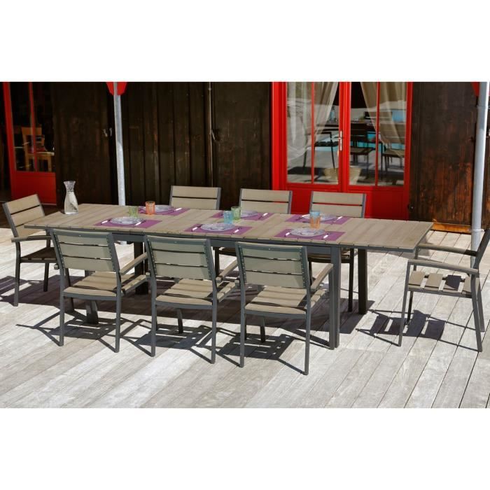 Salon de jardin 9 pieces en aluminium et nowood ( résine synthétique imitation bois ) composé d'une table a rallonge 200 - 300 et de 8 fauteuils - Structure aluminium - Inoxydable