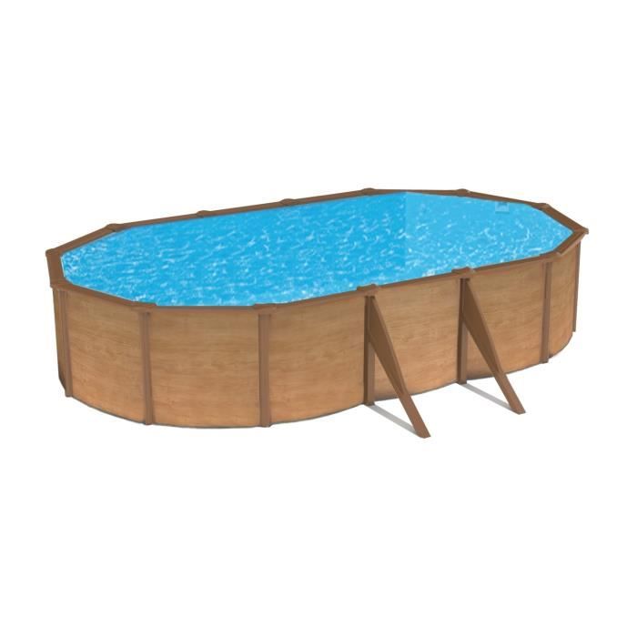 Piscine en métal hors sol aspect bois - Dimensions hors tout : 6,40x3,90x1,20 m - Dimensions intérieures : 6,10x3,60m - Filtre a sable 4m3/h - Capacité en eau 21m3 - Liner 35/100eme (32,5/100eme) - Tapis de sol - Margelle 15 cm - Echelle de sécurité.