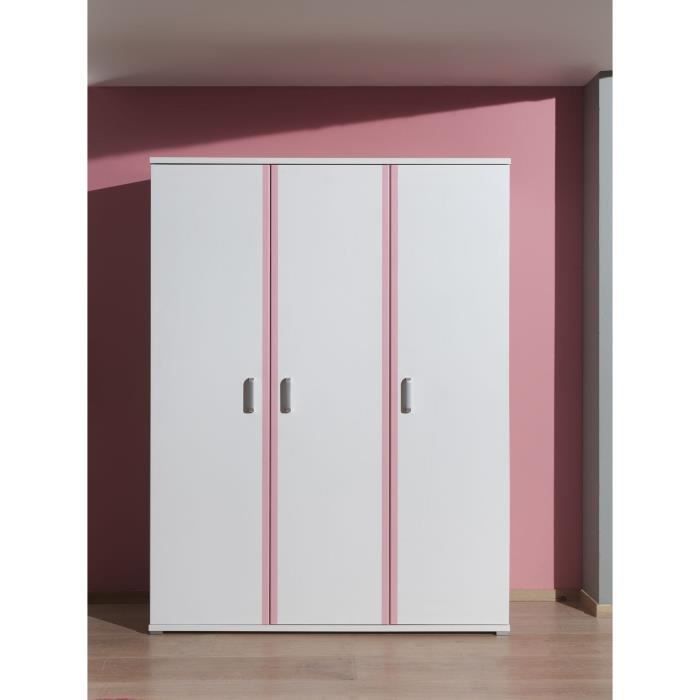 VALENTINE Armoire 3 portes - Coloris : blanc/rose - La répartition de l'armoire est 2/3 penderie et 1/3 lingere - Elle est fabriquée en panneaux de particules de haute qualité