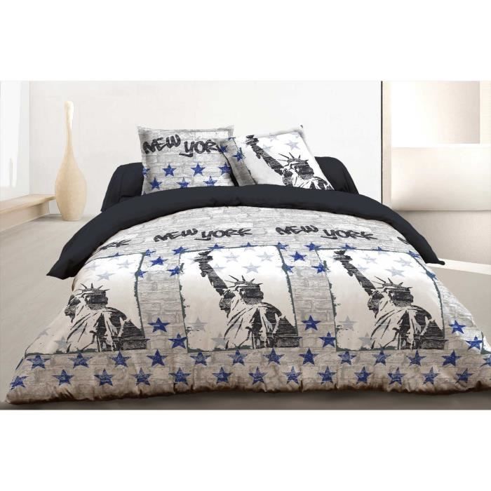 VISION Parure de couette NEW YORK BLUE STAR (240x220cm) comprenant 1 housse de couette + 2 taies d'oreiller (65x65cm) a volant plat. Fermeture par boutons. Coloris : gris, blanc et bleu. Composition : 100% coton avec tissage serré : 57 fils/cm². Lavage a 40°.