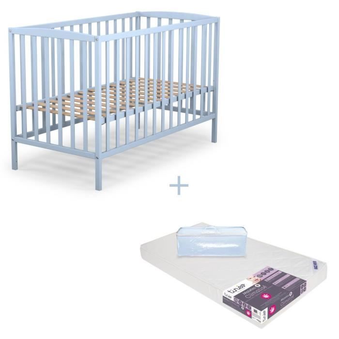 Lit a barreaux avec 2 côtés fixes - Sommier a lattes réglable 3 positions - Fabriqué 100% en bois de hetre. Matelas climatisé. Couchage : 60 cm x 120 cm. Largeur 11 cm. 2 faces de couchage : été et hiver. 16 kg/m3. Des la naissance - Garçon - Livré a l'unité